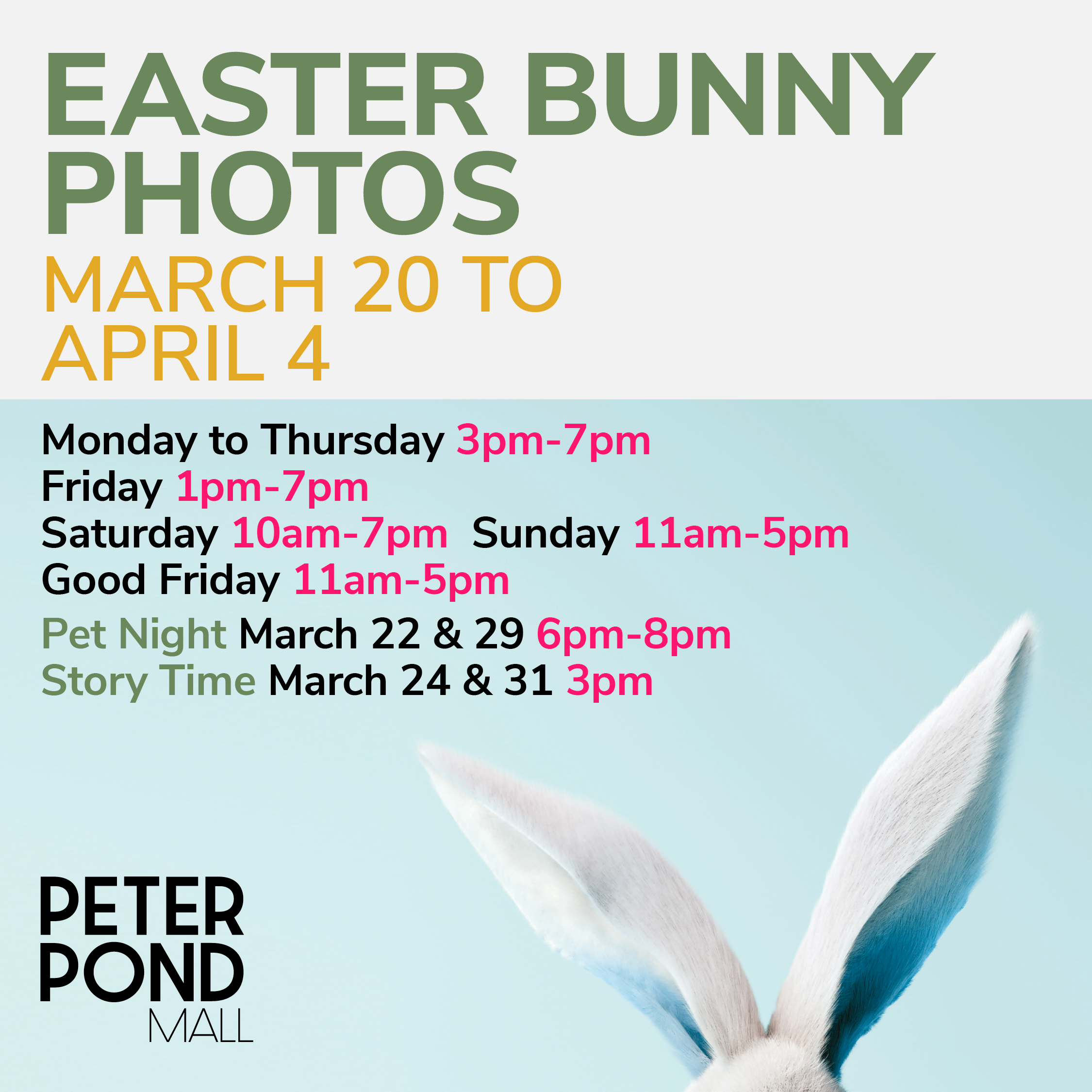 Have a furry friend who wants in on the fun? Join us for Pet Photos with the Easter Bunny on Sunday, March 22nd and 29th from 6 to 8 pm—by reservation only. Book Pet Photos HERE!